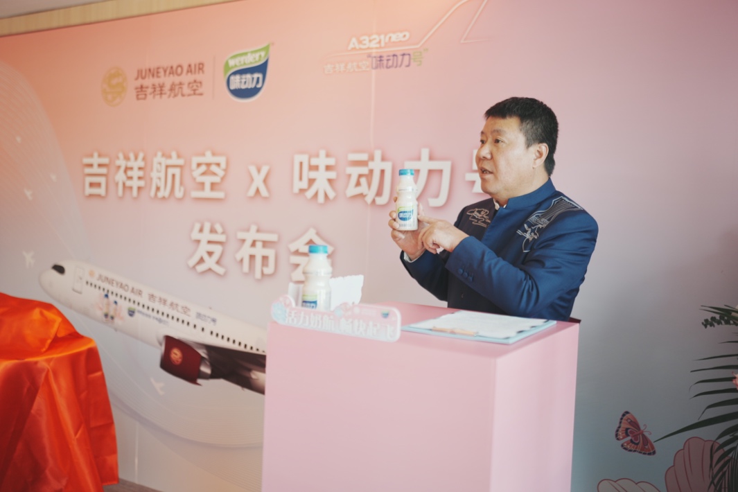 2024年10月9日,吉祥航空与均瑶健康在位于上海虹桥国际机场T2航站楼的V6“似锦”贵宾厅联合官宣“味动力号”全新彩绘飞机新涂装。这也是均瑶集团旗下航空与健康两个板块继乳酸菌饮品上机供应后,再次携手开展跨界营销,为民航内外产业深度融合发展提供又一实践案例。