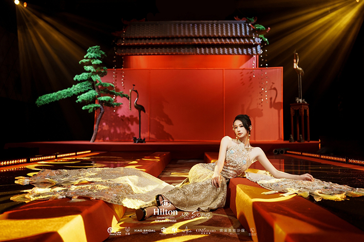 特别的礼服展示环节中,我们邀请了婚礼礼服设计师潇潇老师呈现经典与现代的交织,细腻的刺绣、优雅的剪裁、华丽的珠片装饰,所有的设计元素都在婚礼礼服上得到了完美展现,仿佛在述说着爱情的历史与永恒。
