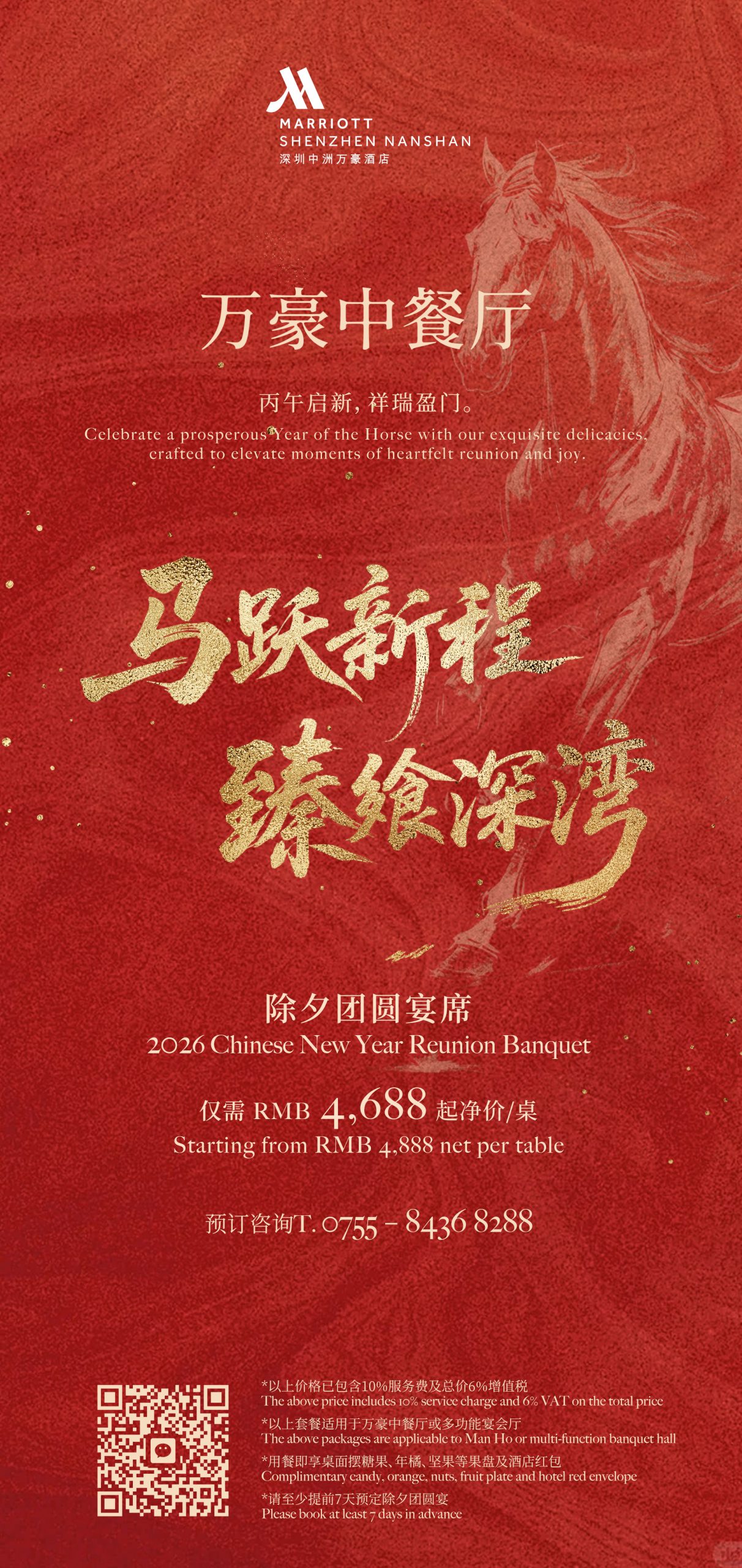 启一元复始,待四序更新,更多新春礼遇详情及预定请致电:0755 – 8436 8288。