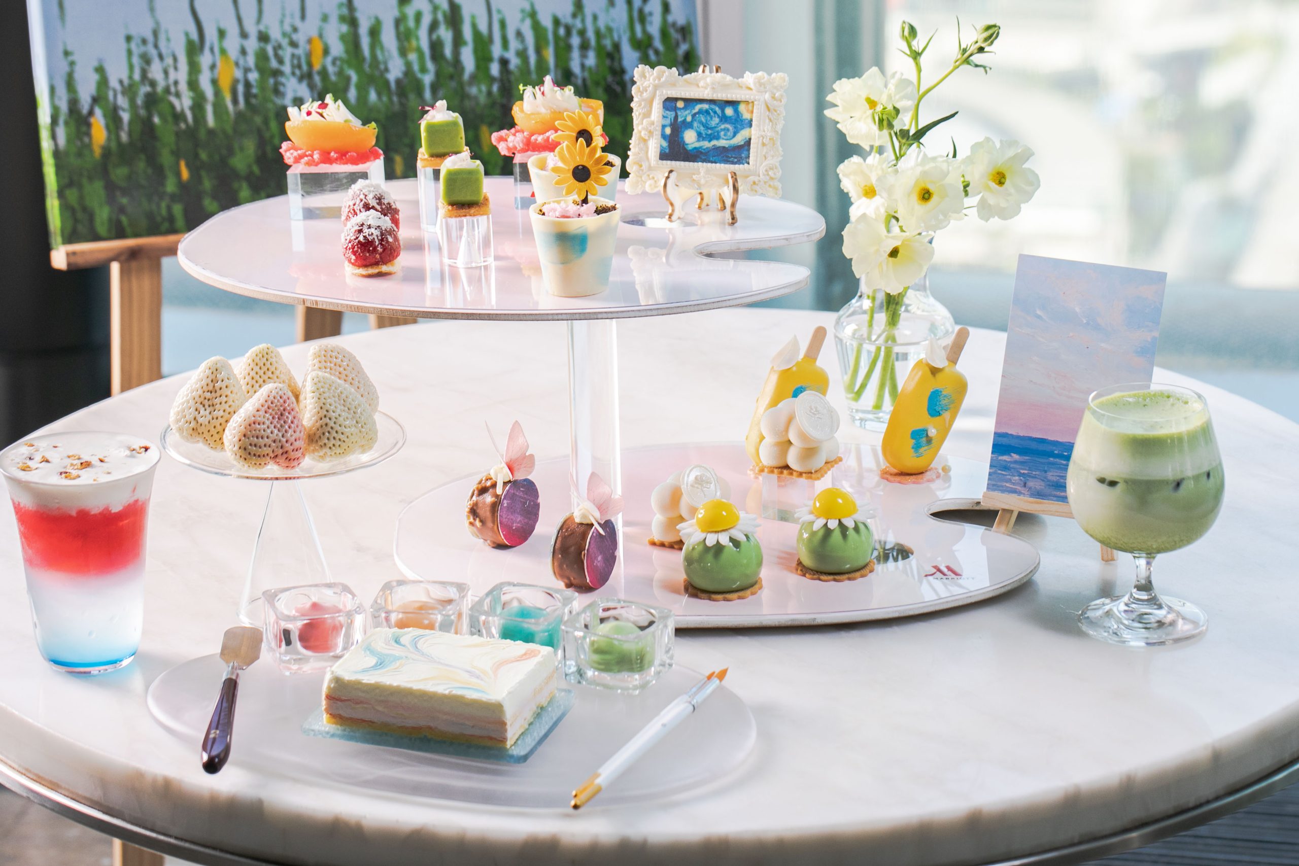 春意渐浓,万物复苏。位于酒店43层的大堂酒廊化身云端艺廊,诚邀宾客置身于高空画卷之中,以味蕾为笔,品味一抹从舌尖沁入心间的春日斑斓。本次“绮绘春熙”主题下午茶以油画为灵感,匠心打造九款创意茶点——六款甜点与三款咸点交相辉映,宛如春日调色盘上的绚丽笔触。奥利奥提拉米苏,以太阳花盆栽为灵感,甜美的提拉米苏藏匿于可爱造型之下,恰如春日午后的暖阳;百香果芝士蛋糕淡紫色蝴蝶栩栩如生,停驻于奶香浓郁的芝士蛋糕之上。仿佛春日花园里,一场不期而遇的浪漫;水蜜桃椰子蛋糕以缤纷奶油为颜料任宾客创作,蜜桃的清甜与椰香的温柔在舌尖交融,让艺术时光,在味蕾上静静流淌。此外,樱桃酸奶蛋糕柠香树番茄百合盏与青豆慕斯白草莓两款咸点,则以明快的酸甜节奏与清新蔬香,为春日午后增添灵动的味觉层次。